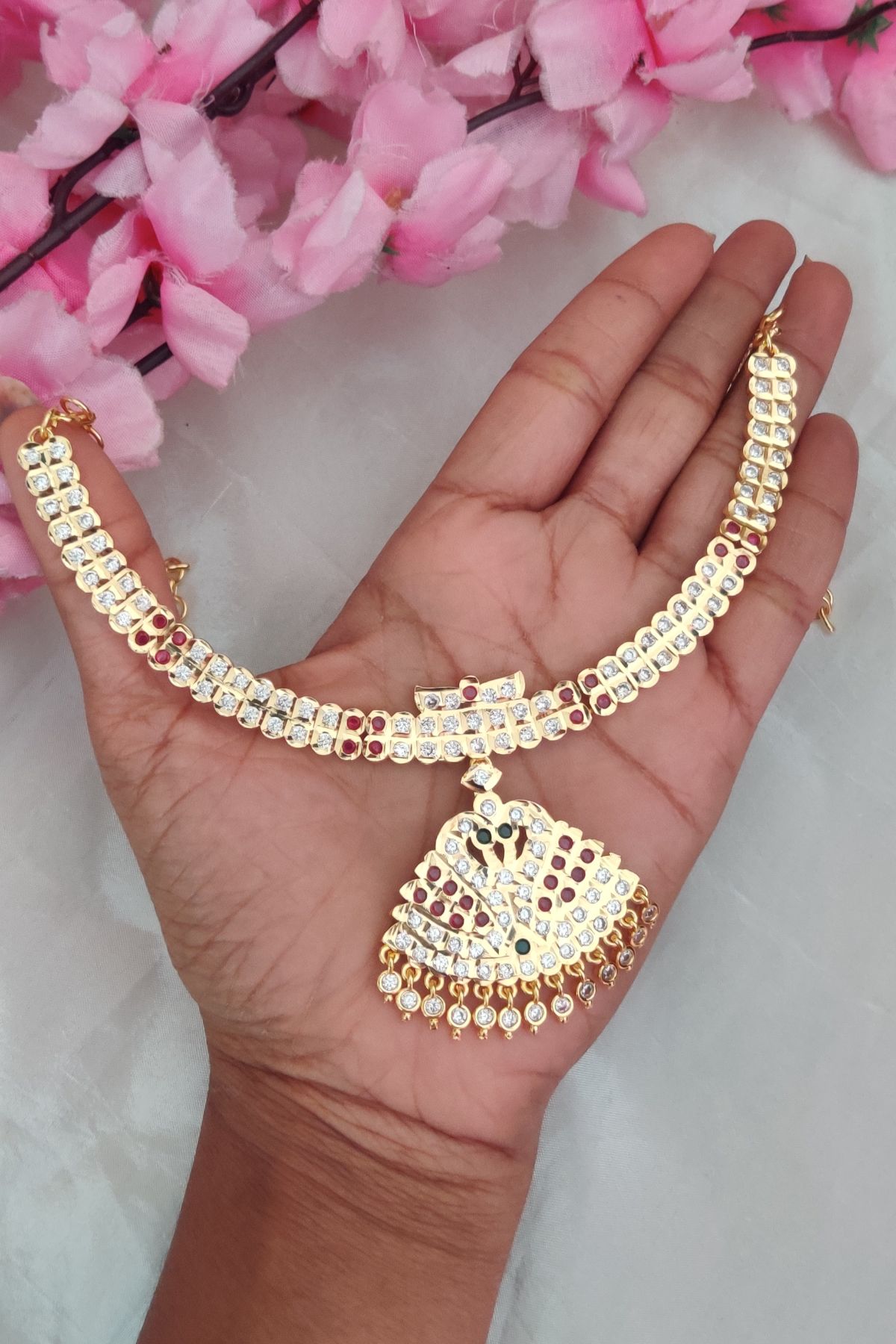 Impon Multi Colour Stone Attigai is a fashion jewellery product. It is not made of real gold, silver, or precious metals. Slight variation in color or finish may occur due to screen settings and lighting conditions.