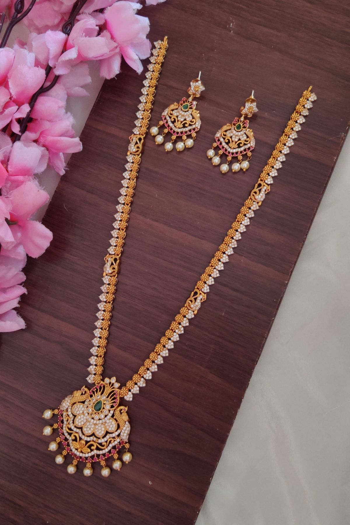 Peacock Designer Pearls Hanging Long Necklace is a fashion jewellery product. It is not made of real gold, silver, or precious metals. Slight variation in color or finish may occur due to screen settings and lighting conditions.